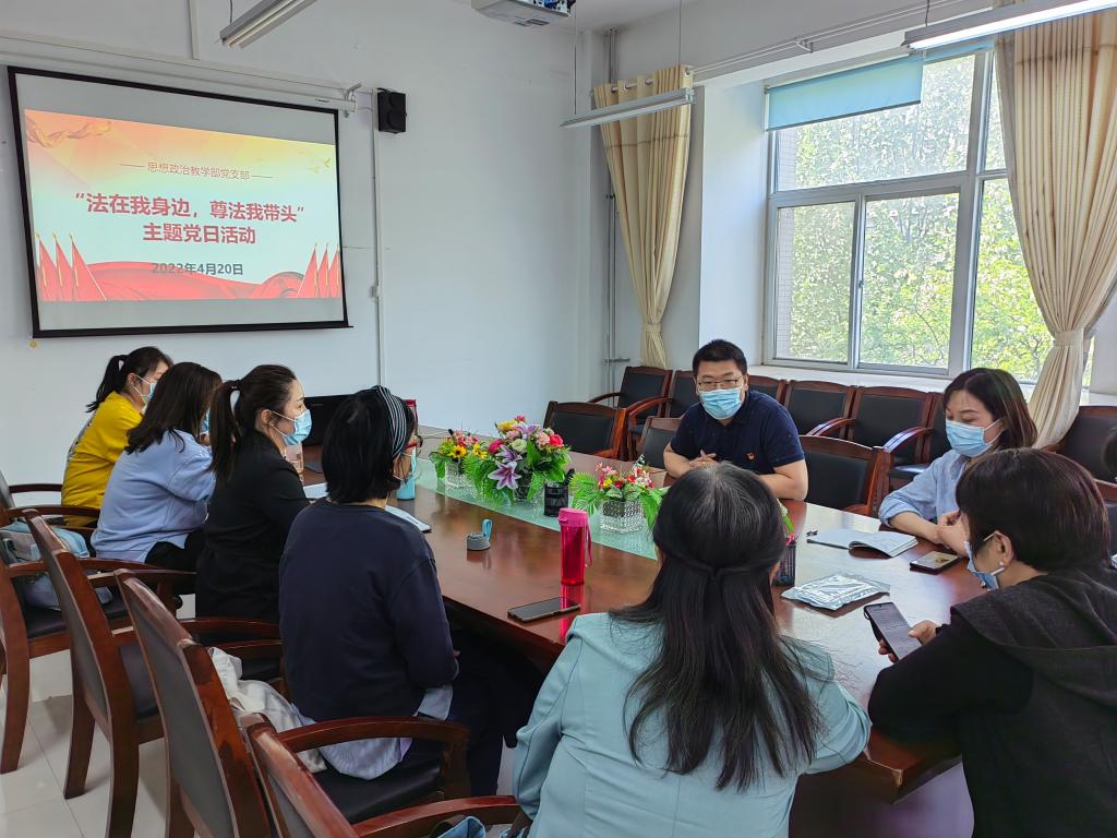 4月20日下午,思想政治教学部党支部在马克思主义学院会议室开展“法在我身边、尊法我带头”主题党日活动。思政部党支部全体党员参加活动,活动由党支部书记刘喜要主持。