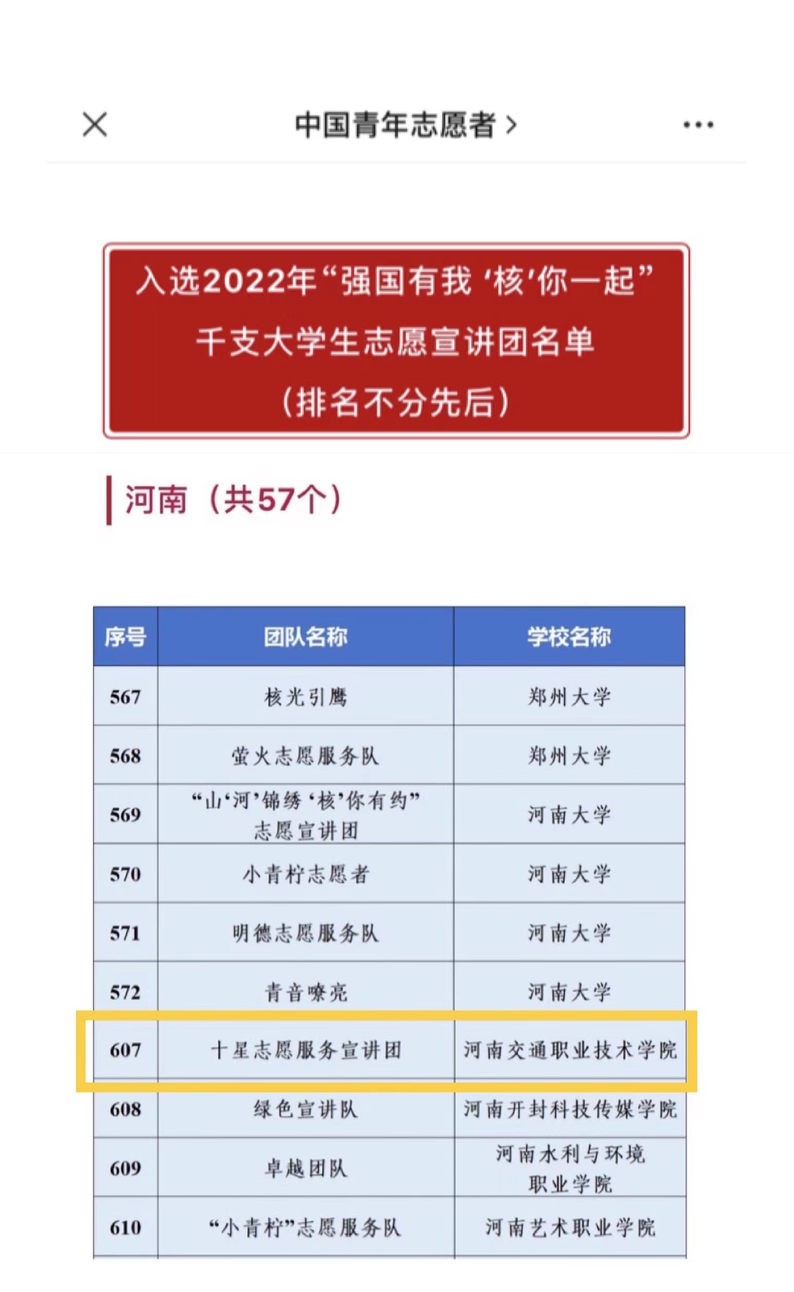 日前,为响应团中央2022年“强国有我‘核’你一起”大学生志愿宣讲活动的号召,在校团委的指导下,我校青年志愿者组织成立了十星志愿宣讲团,并于今年4月成功入选全国千支大学生志愿宣讲团名单。该活动由团中央青年志愿者行动指导中心、中国核工业集团有限公司和中国青年志愿者协会秘书处联合举办。