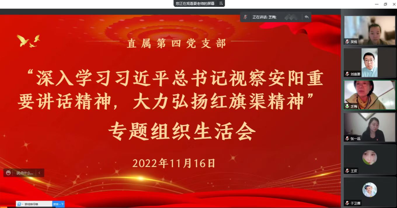 11月16日下午,直属第四党支部召开“深入学习习近平总书记视察安阳重要讲话精神,大力弘扬红旗渠精神”专题组织生活会。会议采取腾讯会议线上方式进行,支部全体党员参加会议,会议由支部书记刘喜要主持。副校长刘芝梅以普通党员身份参加专题组织生活会。