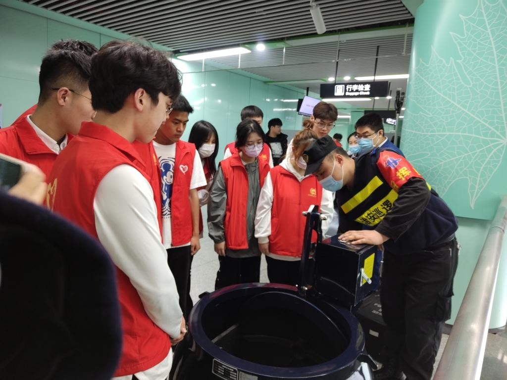 随后,在站台工作人员的引导下,学生们走进现场了解了票务设备、站台安全设施、安检设备及电扶梯安全乘坐等内容。最后汽车学院60余名师生模拟乘客乘车流程,由出入口入站,使用多种方式购票进站、通过安检机、刷票过闸、站台候车,圆满完成了节假日期间的大客流应急模拟演练任务。