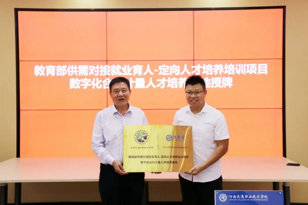 仪式上,成超代表计支宝公司授予公路学院“教育部供需对接就业育人-定向人才培养培训项目”数字化合约计量人才培养基地牌匾,宁金成代表公路学院接过牌匾。王永与计支宝公司代表成超签订了人才培养校企合作框架协议。
