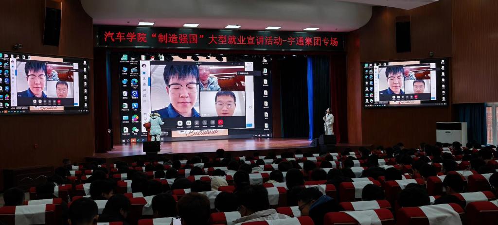宣讲会上,李丽向同学们详细介绍了宇通集团的发展历程、企业文化、企业产品、人才需求、招聘职位及薪酬福利等方面的相关政策,并现场为同学们答疑解惑,让学生对企业有了更深层次的了解。目前在宇通集团实习的汽车学院21级实习生冯祥、刘振宇现场向同学们分享了在宇通集团实习的实际情况和感受。在宇通集团海外岗位工作的20级毕业生李志、盛衡宇,通过视频连线分享了工作经验并和现场同学们交流互动,希望同学们对宇通集团有更充分的了解。在招聘宣讲会现场,学生们积极踊跃参与,提问互动环节会场气氛高涨。