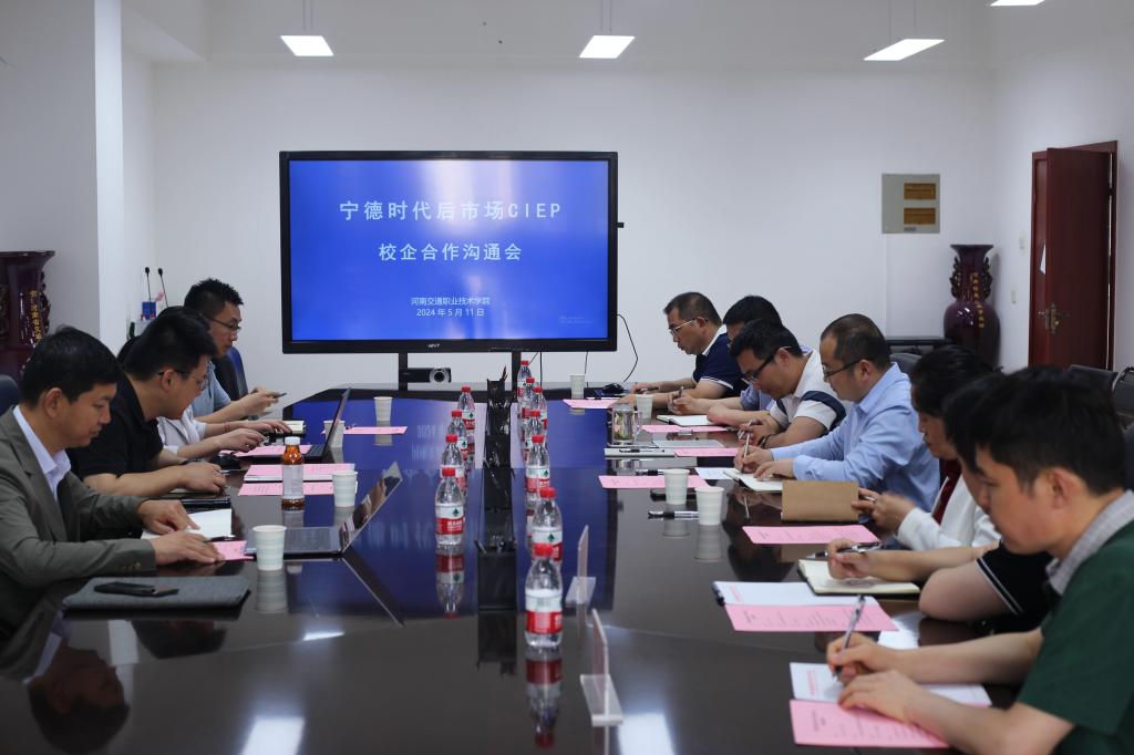 5月11日,宁德时代新能源后市场培训中心经理陶铭超等一行到我校汽车学院洽谈宁德时代后市场CIEP校企合作项目。汽车学院副院长杨长征及相关专业负责人参加洽谈会。