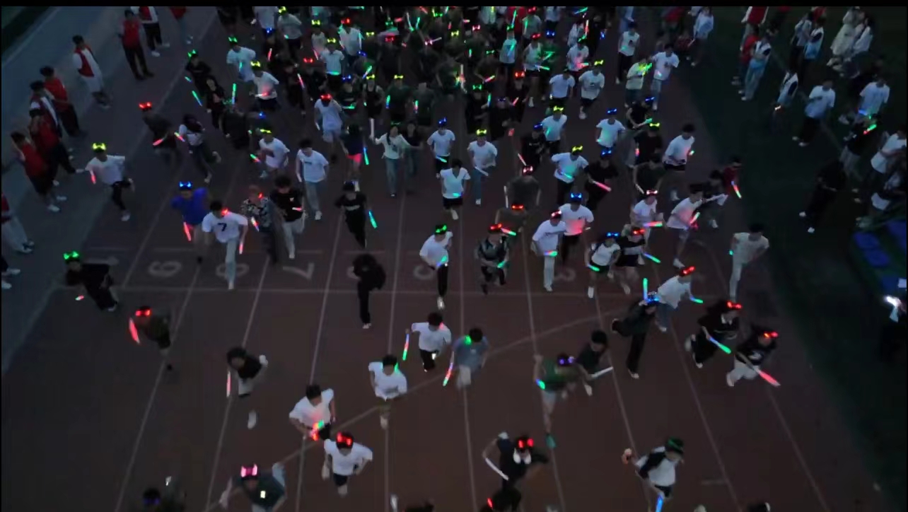 随着发令枪打响,同学们冲过起点线,挥舞着手中的荧光棒活力开跑,你追我赶,奋勇争先,奔腾的身影仿佛耀眼的星河流动在校园之中。点点荧光点亮了夜晚,更点亮了同学们心中的那份坚定与执着。同学们穿越时光隧道,以脚步丈量历史,以汗水诠释青春。