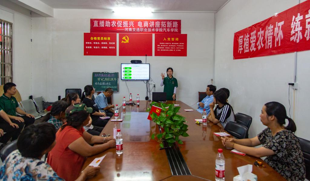推普实践团在秦围孜村党群服务中心开设农业政策和技能培训班,针对农机具购置补贴、农村土地承包经营权流转、实际种粮农民一次性补贴政策等村民们关心的热点问题,用朴实的语言把“文件语”变成“百姓话”,拉近与村民之间的距离,把党和国家的惠农好政策讲清楚、讲明白,让村民听得懂、能领会、可落实。同时,还向村民发放了农机维护保养宣传手册、宣传资料300余份,教授老龄农户下载和使用“河南农机云平台”APP,帮助他们学会注册、发布任务等,让他们学会如何在农忙时节及时联系和调配最近距离的收割机;针对困扰红薯种植大户的“产品好,销量难”的问题,实践团通过开展电商直播讲座,在对农户们进行讲好普通话、认识常用字教学的基础上,重点进行自媒体直播软件及设备使用等的相关培训,辅导农户使用普通话进行电商直播,提高直播过程中普通话运用能力,使农户更好地对红薯产品进行介绍、宣传与推广,从而推动红薯产品销售,拓宽致富道路。