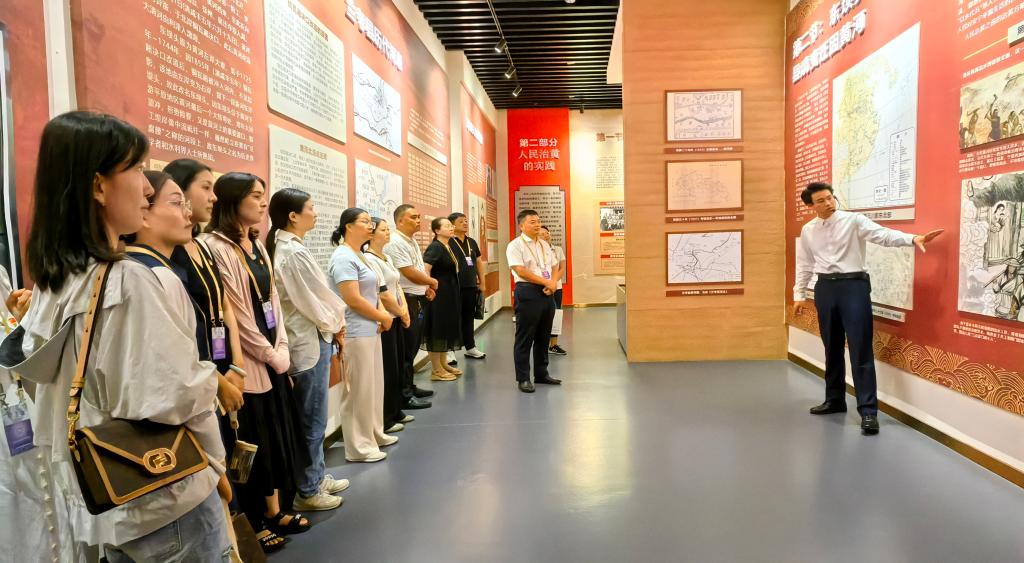 在黄河湾东坝头教学点,大家参观了毛泽东视察黄河纪念亭,通过现场专业人员的细致讲解,党员们深入了解了昔日黄河湾洪水多次泛滥的苦难历史,感受到了党和国家领导人治理黄河水患的坚定决心。