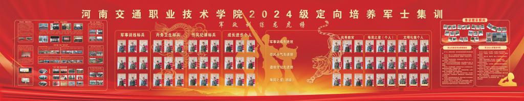 集训伊始,为激发军士新生训练热情,学校在集训地制作了一副长约16米的军政训练喷绘展板,对定向培养军士的发展历程和过往荣誉进行展示,并在龙虎榜上设训练标兵、内务标兵、成长进步个人和优秀教官等栏目,实时对集训队中表现优异的新生和教官进行表彰。