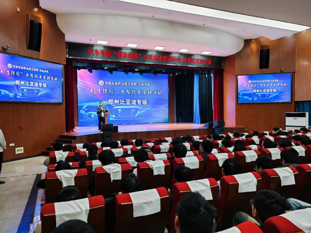 12月6日下午,郑州比亚迪汽车有限公司(以下简称比亚迪)在我校航海路校区举行“制造强国”企业宣讲会。宣讲会由郑州比亚迪第十一事业部人事科主管王旭主讲,汽车学院相关负责人主持,2023年级比亚迪冠名班200余名学生参加宣讲会。