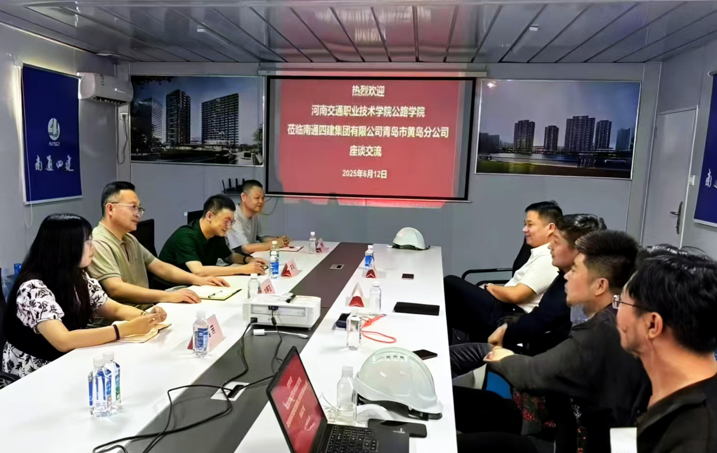 6月12日,招生就业处处长郭强、公路学院党总支书记刘甲玉一行4人前往南通四建集团有限公司青岛市黄岛分公司(以下简称“南通四建”)开展访企拓岗活动。南通四建项目部负责人、学校优秀毕业生曹磊、贠晓亮等参加相关活动。
