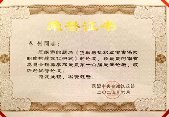 学校民盟盟员乔剑撰写的论文《货车司机职业伤害保险制度构建优化研究》,以“关注货车司机为代表的新就业劳动者权益维护”为主题,系统阐述了货车司机职业伤害保险制度的构建,从政府部门、保险机构、平台及从业者等各主体视角,聚焦民主党派参政议政权益,为加强货车司机职业伤害保险制度建言献策,推动我国货车司机职业伤害保险制度的创新构建,为我国公路货运行业高质量发展提供有效支撑。该论文经民盟省委推荐,被民盟中央评选为优秀论文。