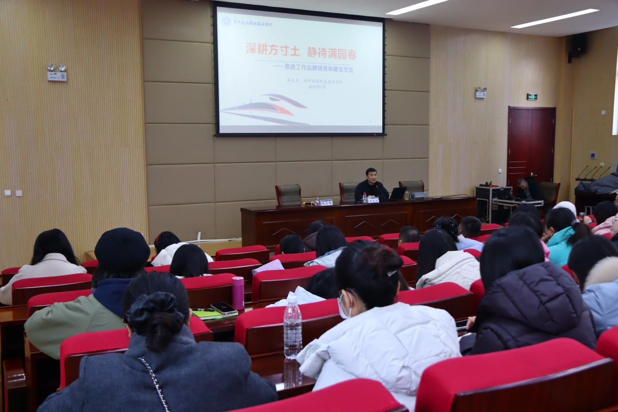 1月16日上午,党委宣传部举办思想政治工作品牌项目培育专家辅导报告会,邀请郑州铁路职业技术学院副教授高文天到校辅导,党委宣传部负责人主持。