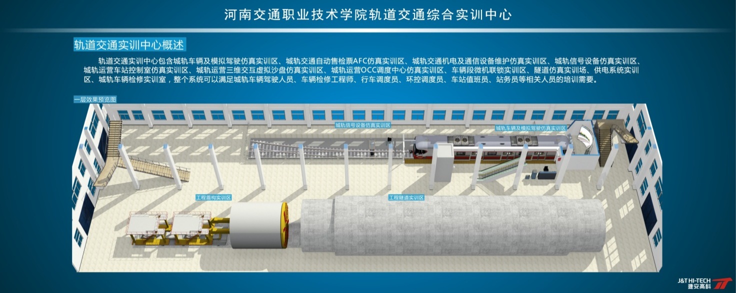 轨道交通实训中心包含城轨车辆及模拟驾驶仿真实训区,城轨交通自动售检票AFC仿真实训区,城轨交通机电及通信设备维护仿真实训区,城轨信号仿真实训区,城轨运营车站控制仿真实训区,城轨运营三维交互模拟沙盘仿真实训区,城轨运营OCC调度中心仿真实训区,车辆段微机联锁实训区,隧道仿真实训场,供电系统实训区,城轨车辆检修实训室,整个系统可以满足城轨车辆驾驶人员,车辆检修工程师,行车调度员,环控员,站务员等相关人员的培训需要。